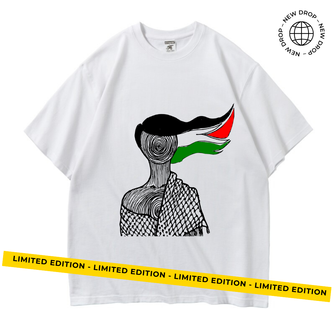 montre une silhouette sans visage, vêtue d’un keffieh, d’où s’élève un drapeau à la place de la tête — une image d’identité, de résilience et d’espoir au milieu du chaos.