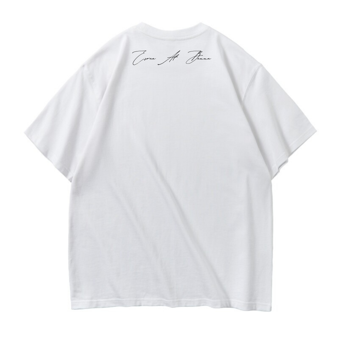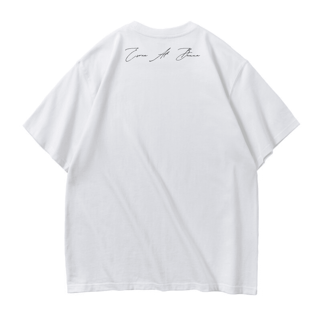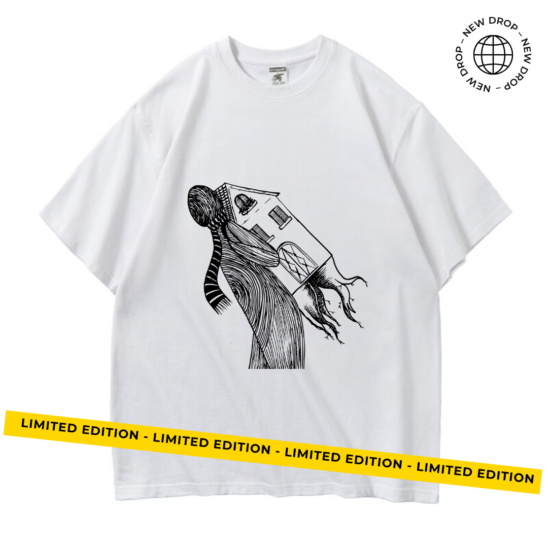 représente son déplacement forcé depuis Gaza : une silhouette portant sa maison sur le dos, avec des racines suspendues en dessous — symbole de l’arrachement et de la perte de son quartier natal, bombardé par l’armée israélienne.